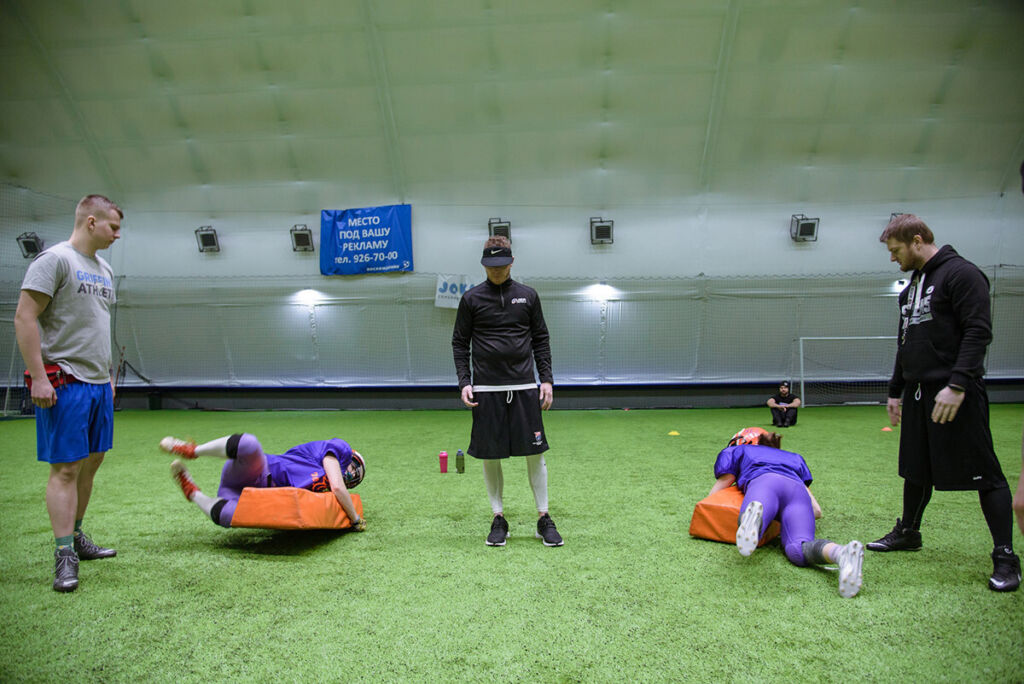 Координатор защиты американской женской сборной по американскому футболу Джеф Грайбаш (в центре) тренирует девушек на сборах в Санкт-Петербурге. Фото: Кристина Бражникова | Гласная