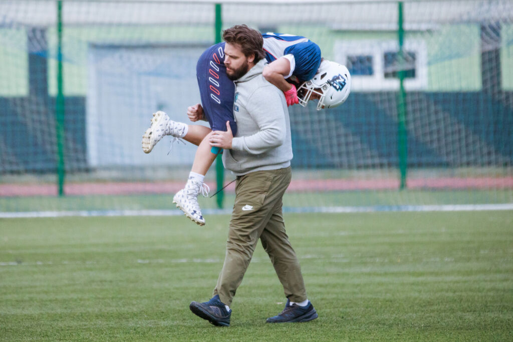Тренер помогает уйти с поля травмированному игроку. Фото: Кристина Бражникова | Гласная
