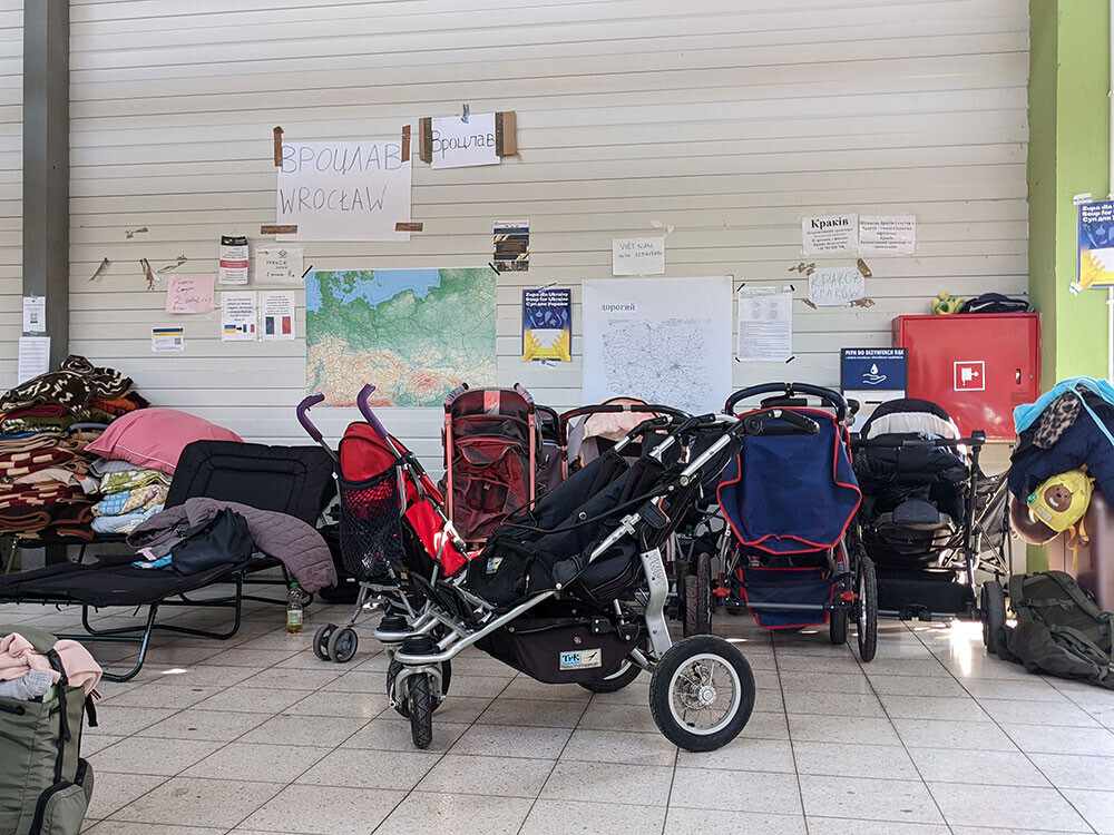Через пункт пересечения польско-украинской границы Корчова-Краковец, названный по близлежащим селам, беженцев перевозят на автобусах. После проверки документов они попадают к нам, в пункт приема внутренне перемещенных лиц. Это огромная металлическая коробка посреди поля в десяти километрах от границы. До спецоперации здесь был торговый центр, но сейчас имущество почти всех магазинов вынесли. В помещениях бывших магазинов теперь гуманитарная помощь и сотни одинаковых черных и темно-зеленых раскладушек.