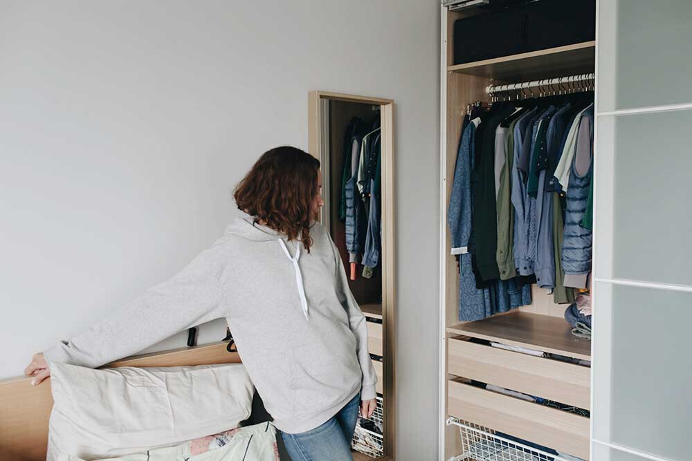 Настя открывает узкий шкаф, внутри на плечиках висит совсем немного вещей: брюки, джинсы, футболки и свитеры. Примерно в одной гамме — оттенки синего, серого, зеленого. В соседнем, таком же узком, шкафу — платья и верхняя одежда. Всего в Настином гардеробе 45 вещей, вместе с верхней одеждой, сумками и обувью. У Максима еще меньше.