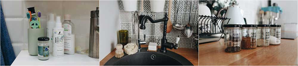 Верхнее фото: Большая часть гардероба Насти. Нижнее фото: Слева: вся косметика, котрой пользуется Настя, натуральная. Зубная паста в баночке из под каперсов, купленная наразвес в zero waste магазине. В центре: Посуду Настя моет органической губкой и мылом. Справа: Специи дома у Насти. все сыпучие продукты настя покупает в zero waste магазинах.Екатерина Резвая | Гласная