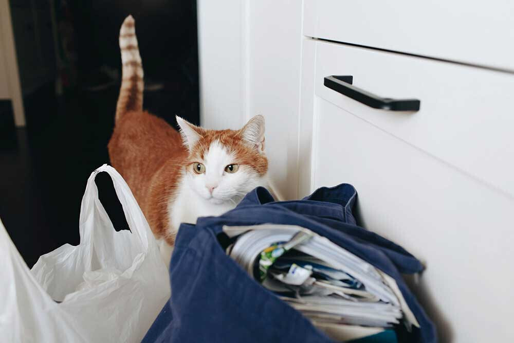 Верхнее фото: Слева: Настя разбирает и сортирует накопленные отходы, чтобы сдать их в переработку. В центре: пакет с отходами, которые собирает Настя, чтобы потом сдать в переработку. Справа: Настя загружает стиральную машину. Гель для стирки тоже из zero waste магазина. Нижнее фото: кот Насти и Максима помогает с сортировкой.Екатерина Резвая | Гласная