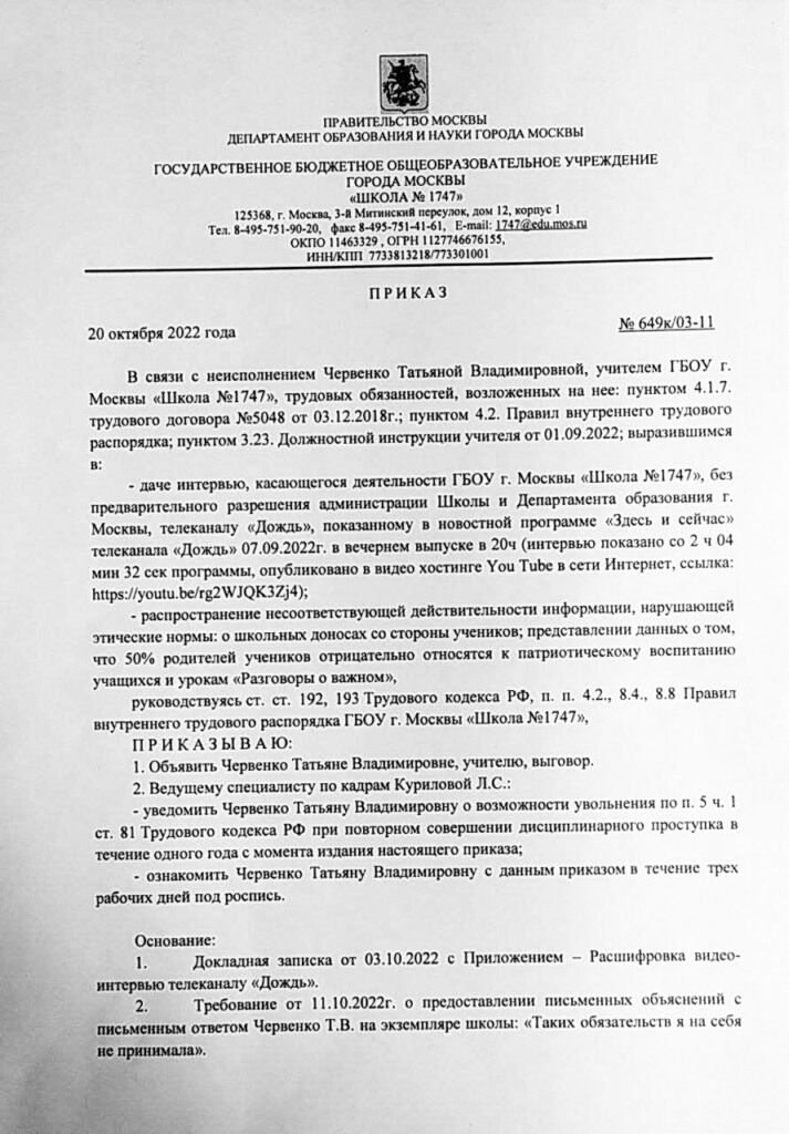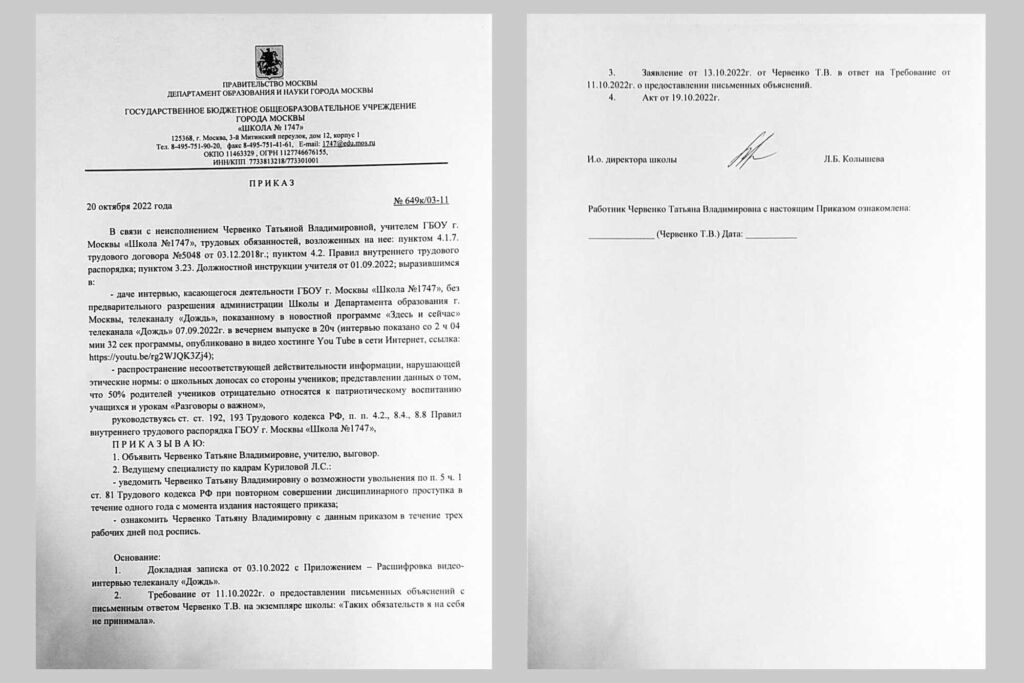За последние недели руководство школы вручило мне два выговора, я оспариваю их в суде — заседания начались 31 октября. Первый принесли 30 сентября. Он был о неисполнении трудовых обязанностей — в том числе приказа «Об организации занятий “Разговоры о важном”» и самовольной замене тем уроков.