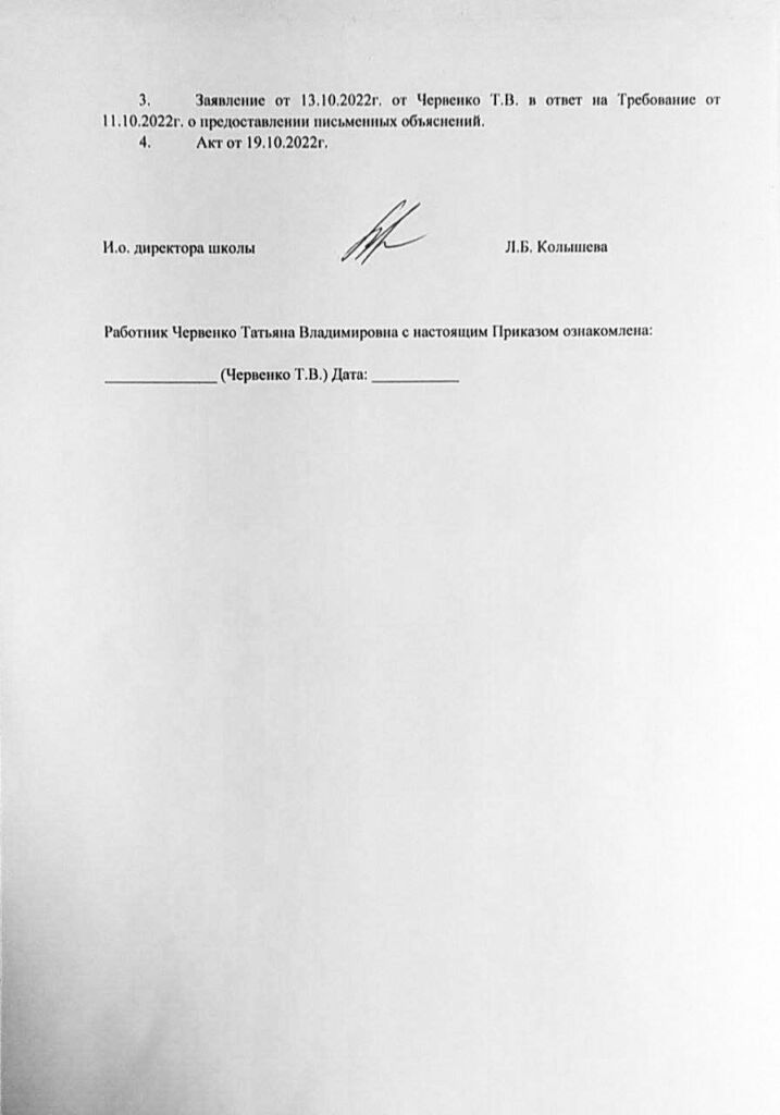 После выхода с больничного мне вручили требование — письменно объясниться за интервью, которое я дала «Дождю» без согласования с руководством школы. Докладную записку — очередной донос — на меня написала председатель нашего школьного профсоюза. И 20 октября на основании этой докладной записки мне вручили второй выговор.