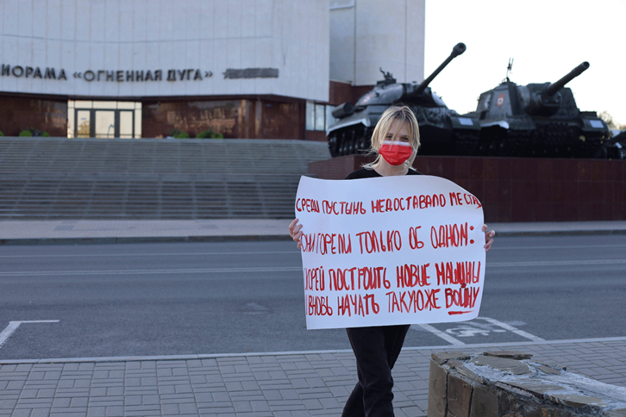 24 августа Алена вышла. Геройствовать она не собиралась. Поэтому выдвинулась из дома почти на рассвете, в семь утра. Поэтому не встала в пикет на центральной площади города, где в тот день дежурила полиция, а выбрала безлюдное место у музея-диорамы «Огненная дуга», напротив танков. И даже там простояла не больше двух минут: приглашенный журналист сделал снимки, которые позже опубликуют местные СМИ, и девушка свернула плакат.