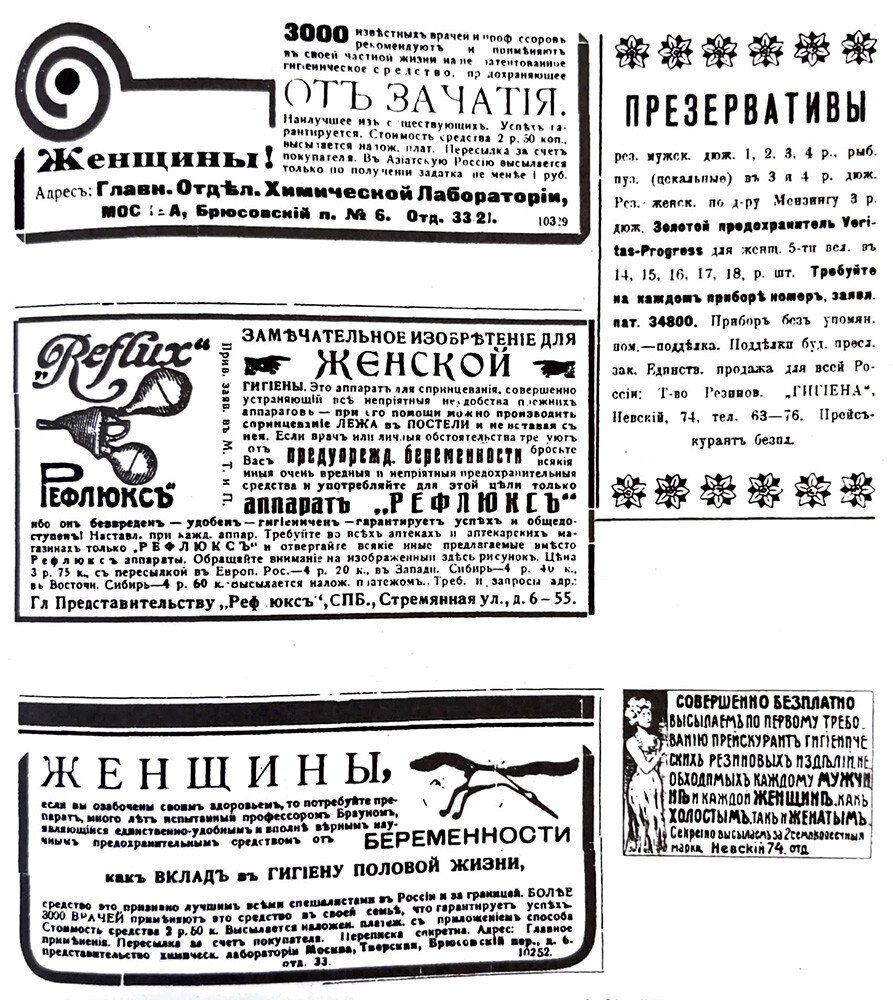 Реклама контрацептивов, опубликована в журнале «Сатирикон» в 1908-1913 г.г. Источник: Библиотека славистики Университета Хельсинки. Воспроизведено по: Engelstein, L. (1992). The Keys to Happiness: Sex and the Search for Modernity in fin-de-Siecle Russia. Cornell University Press. Стр. 347.