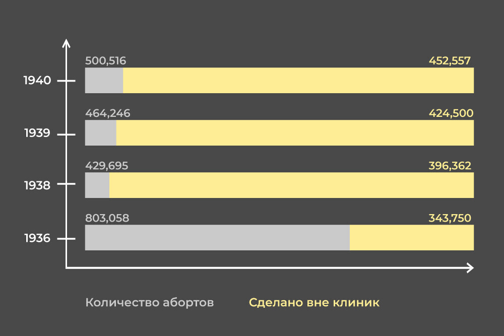 Судя по данным из Москвы и Ленинграда, количество прерванных беременностей после запрета сократилось почти в два раза. Но уже через два года статистика снова поползла вверх. К 1940 году практически все аборты — 452 тысячи из полумиллиона — проводились подпольно.