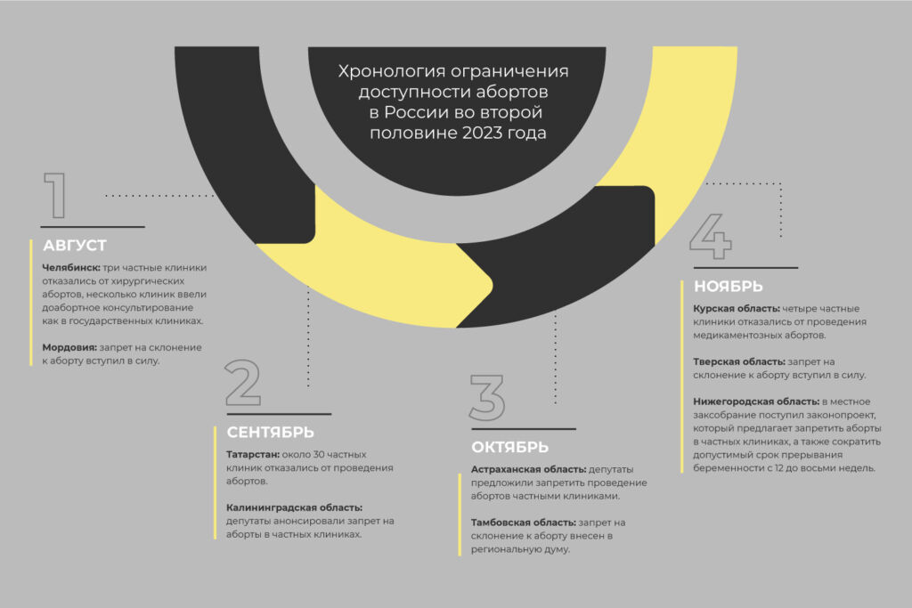 За последние пять месяцев сразу несколько российских регионов ограничили или пообещали ограничить доступ женщин к абортам. Наиболее популярной практикой стал отказ частных клиник проводить аборты: десятки учреждений в разных регионах «добровольно» убирают процедуру из списка услуг после бесед с чиновниками и «рекомендаций» местных администраций. В основном ограничение касается хирургических абортов — его, например, ввели клиники в Челябинске, Татарстане, Астраханской и Калининградской области.