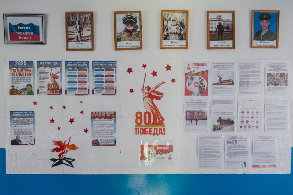 На высоком флагштоке у школы в Верхнем Суэтуке с этого года развевается российский флаг. До 2022-го в школе висел плакат с солнцем и надписью «Добро пожаловать!» на эстонском, но после проверок все, что было связано с Эстонией, убрали, включая стенд с краткой информацией о стране. А изображение солнца заменили портретами местных жителей, ушедших на войну с Украиной.